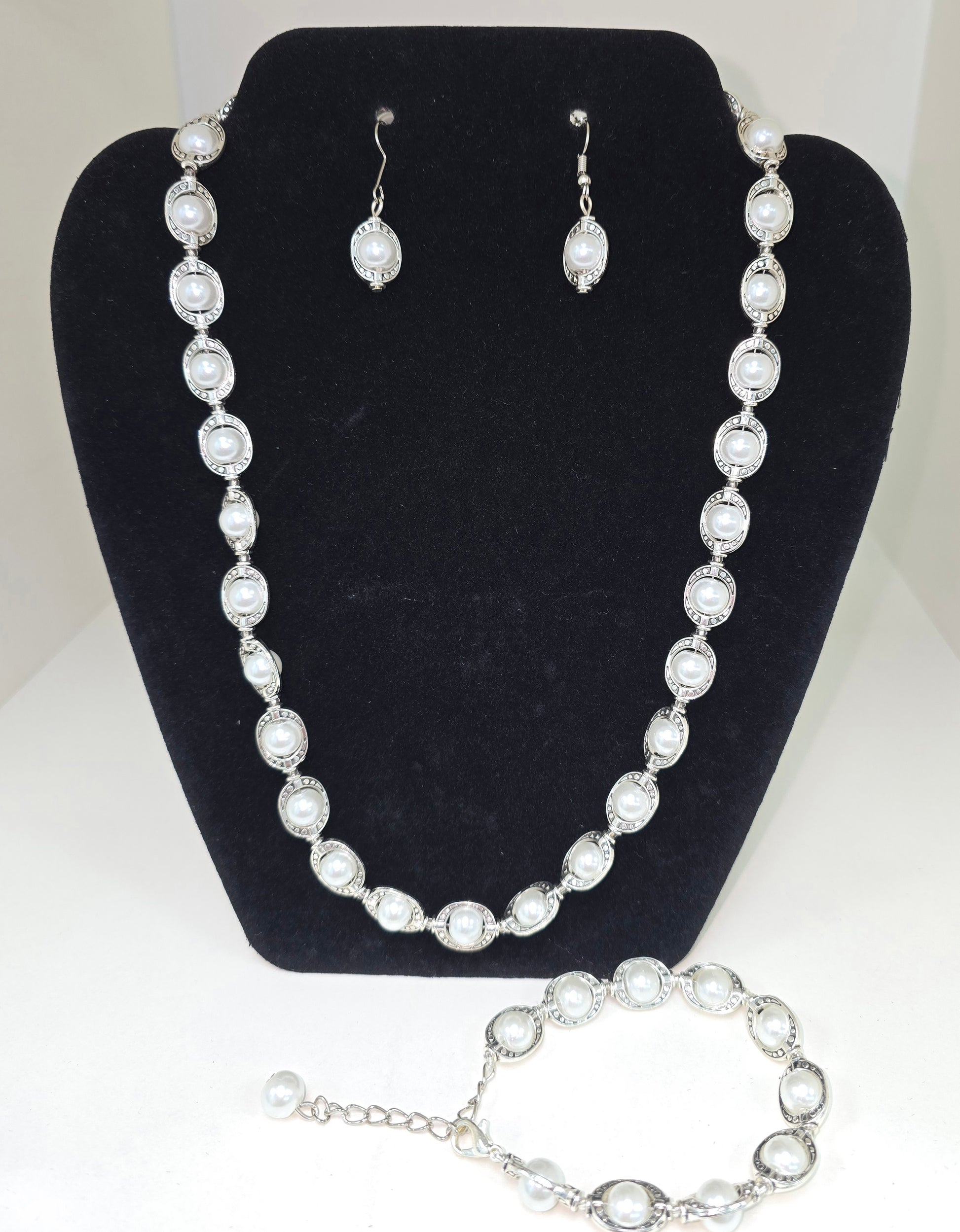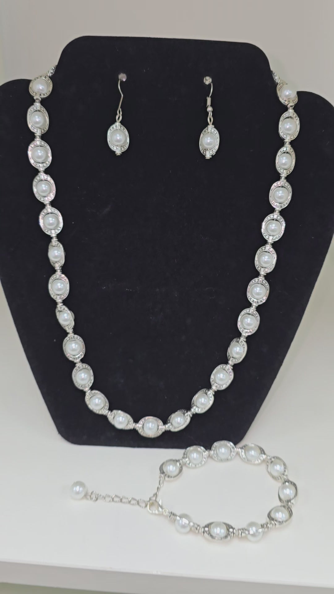 Elevate your style with our designer pearl set in silver! This stunning 4-piece set includes matching earrings and a bracelet, adding the perfect touch of elegance to any outfit. The silver color adds a classic touch, making it a versatile addition to any jewelry collection.