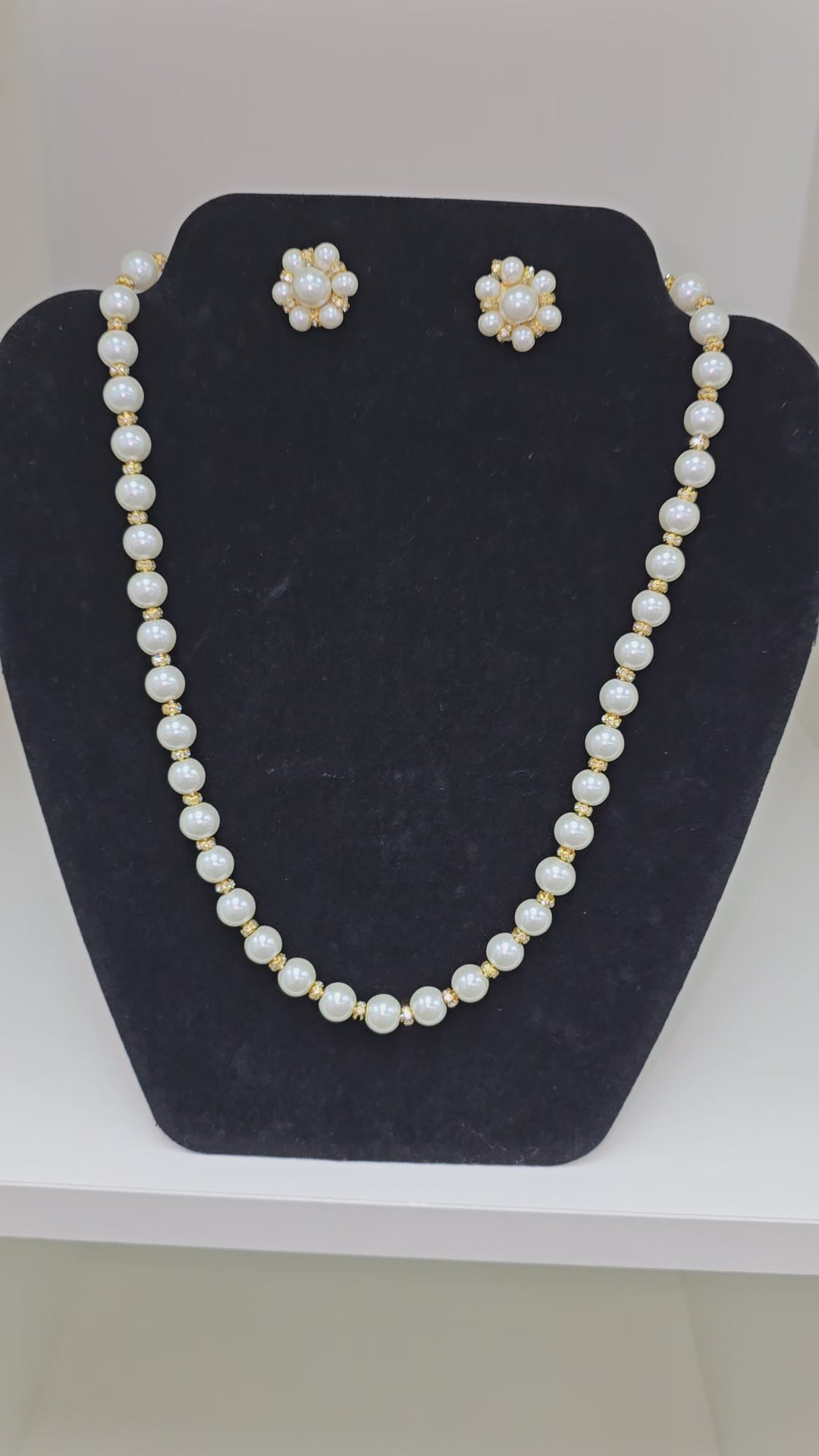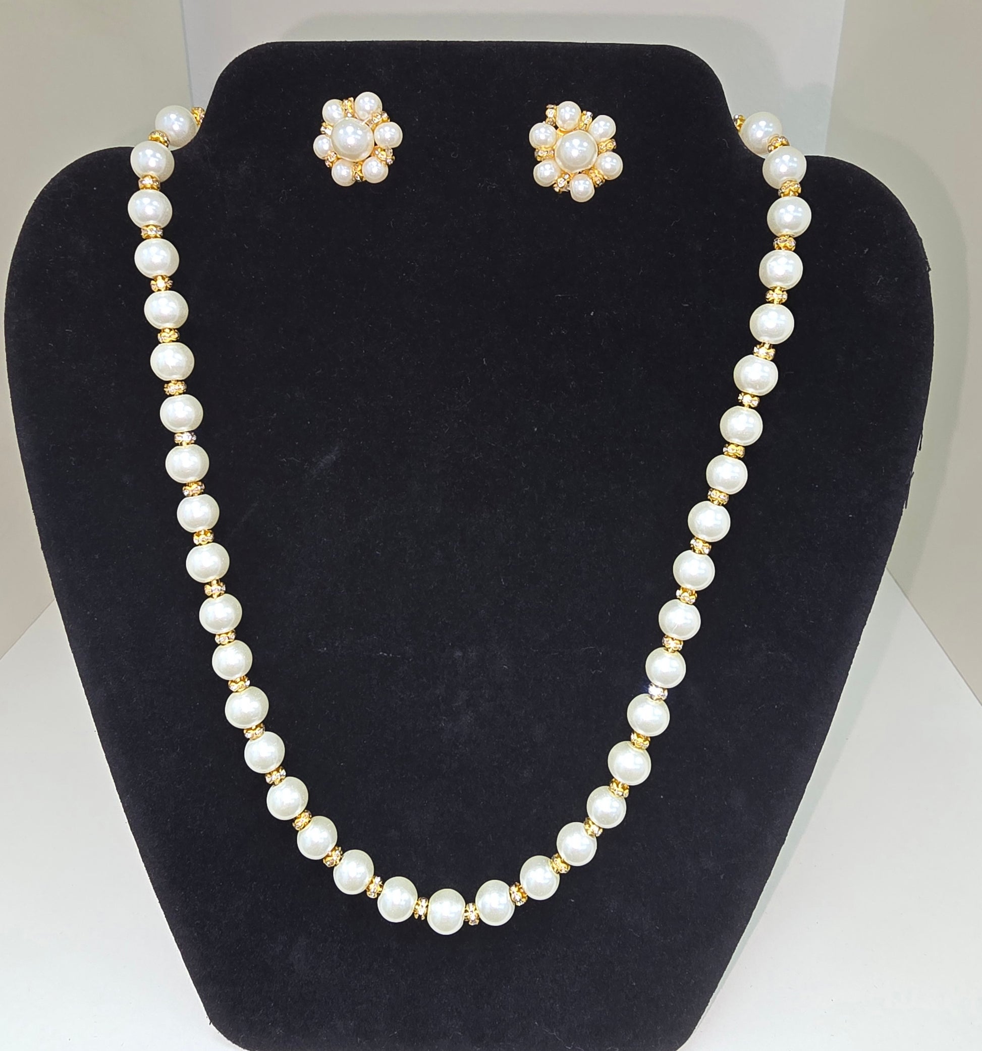 This elegant designer pearl necklace set showcases a timeless and classic style. The set includes a stunning necklace and matching studs, perfect for any formal occasion. Made with high-quality materials, this set exudes sophistication and luxury. Complete your look with this must-have accessory.