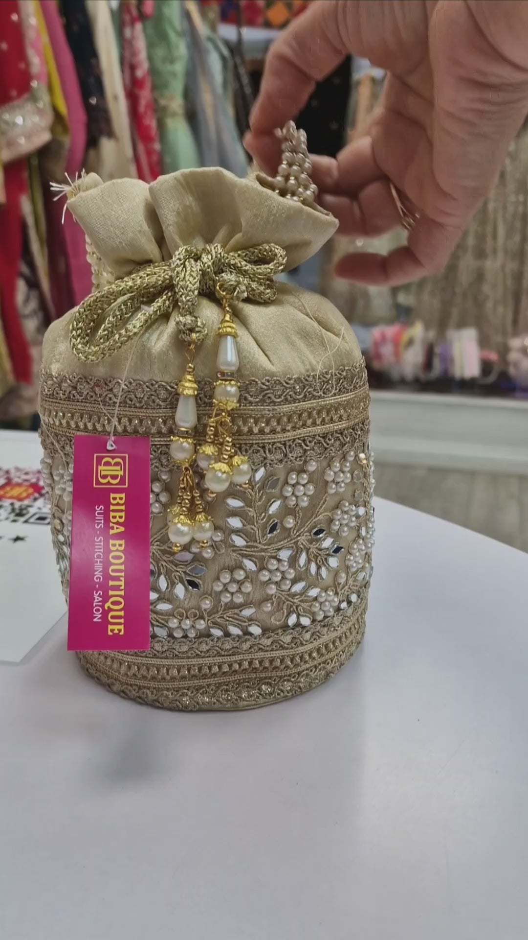 Introducing the Fancy Potli, adorned with intricate gold and mirror work. Perfect for any party, this elegant potli adds a touch of sophistication to any outfit. Handcrafted with expert craftsmanship, it is sure to make you stand out in a crowd. Elevate your style with the Fancy Potli.