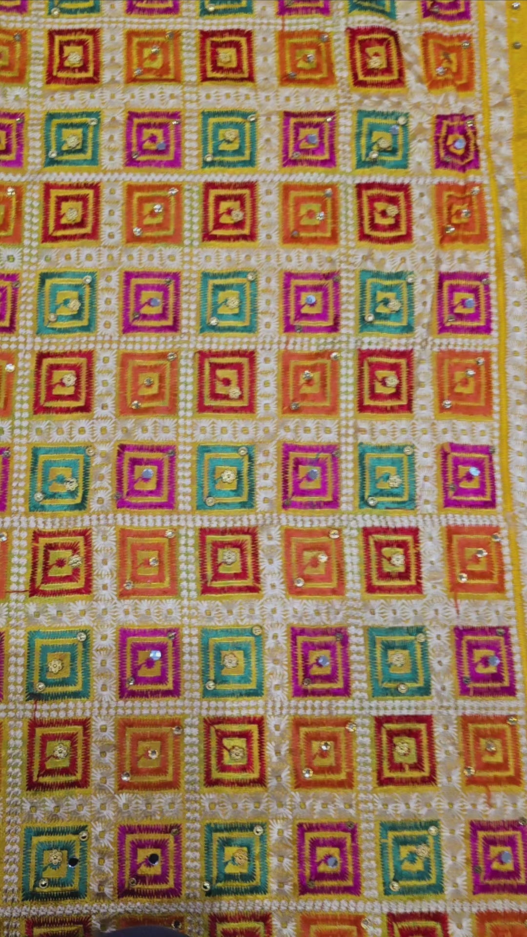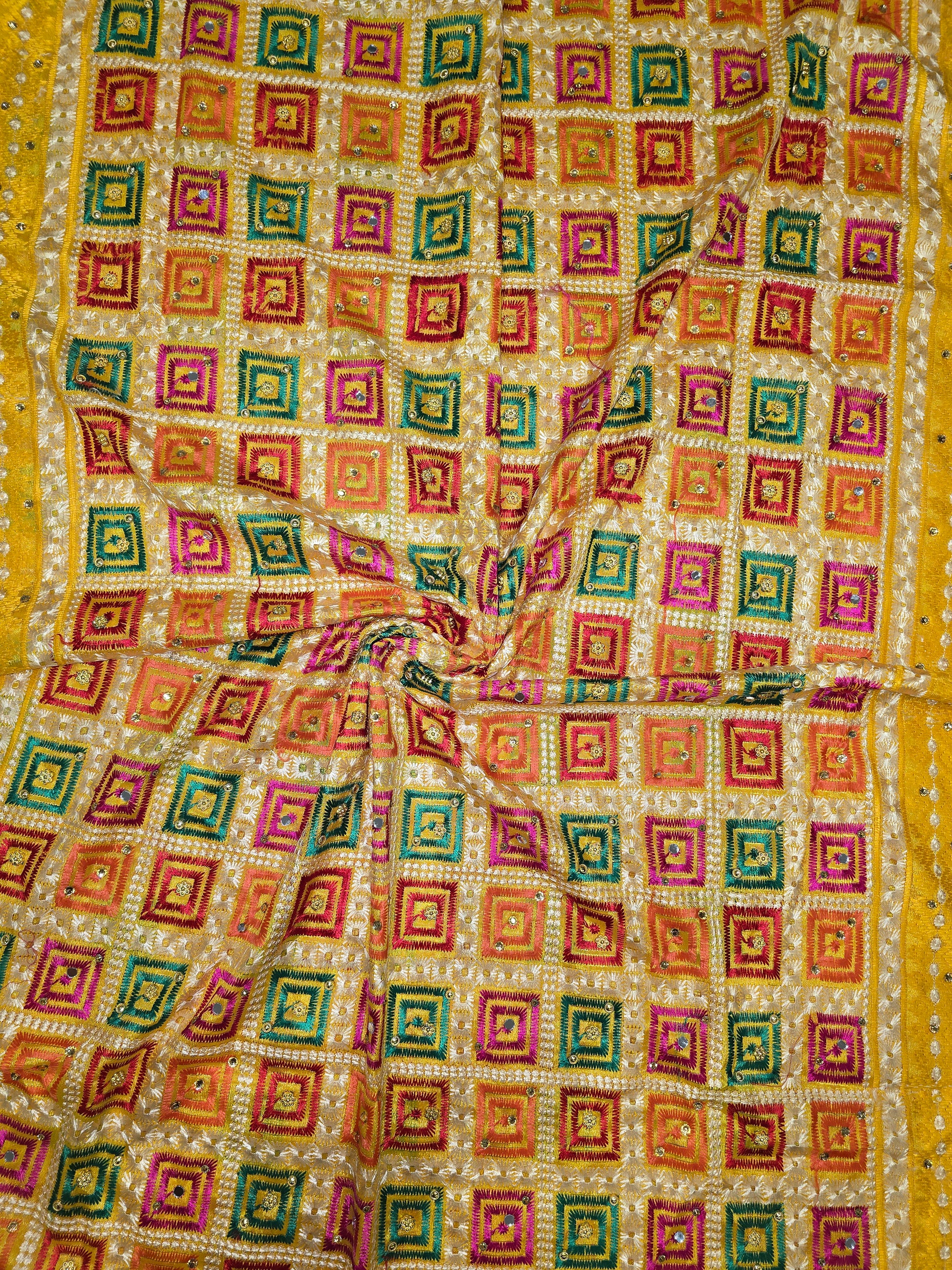 This fancy phulkari boasts a vibrant multicolor design with a striking yellow base. Perfect for parties, the intricate embroidery and quality construction make it a must-have for any occasion. Expertly crafted to elevate your style with a touch of cultural flair.