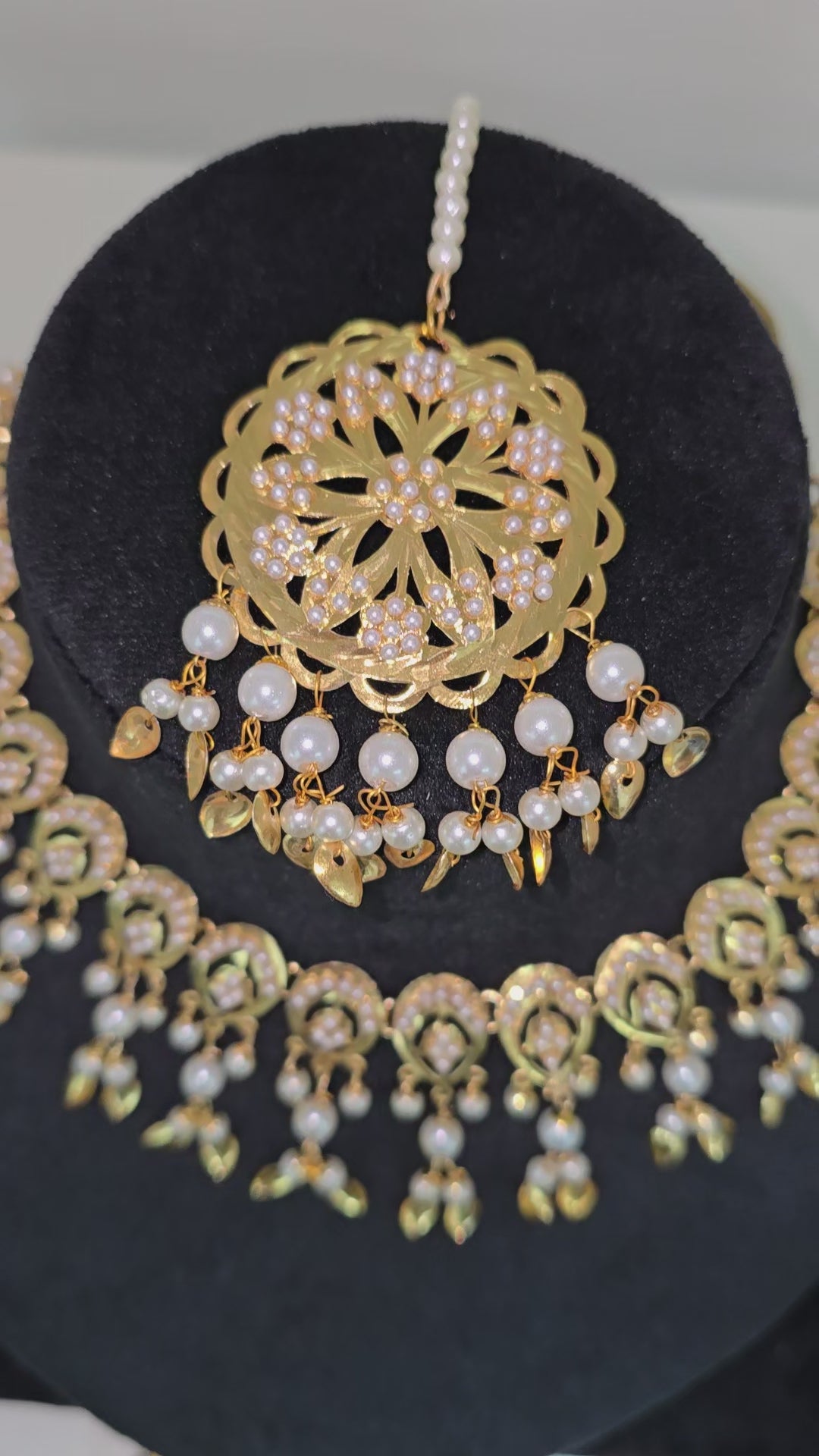 Introducing our Golden Pearl Jarau Pati set, complete with jhumke and tikka. Expertly crafted with intricate details, this set is made with high-quality materials for a luxurious feel. Upgrade your collection with this elegant piece, perfect for any occasion. Limited quantities available.
