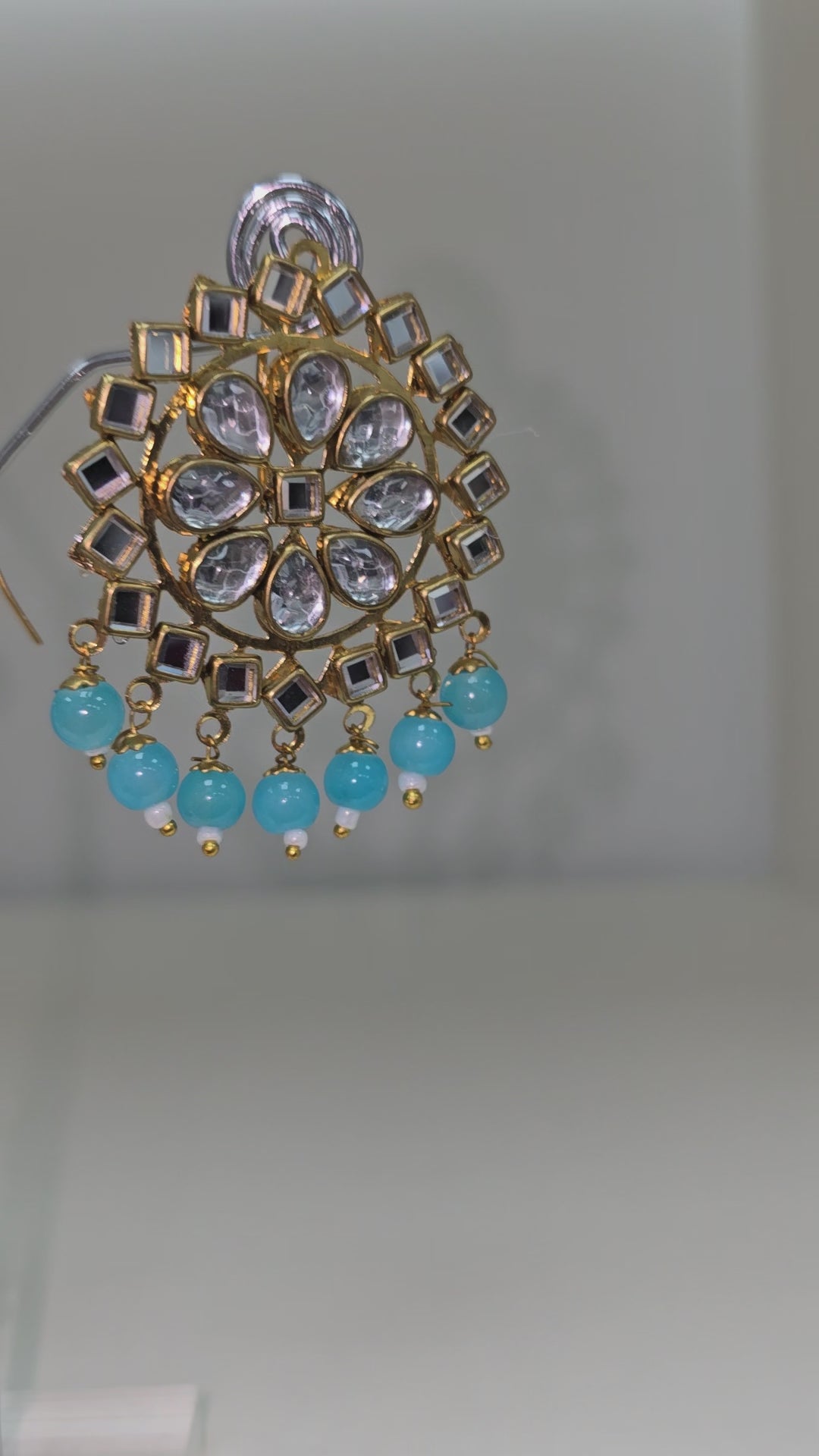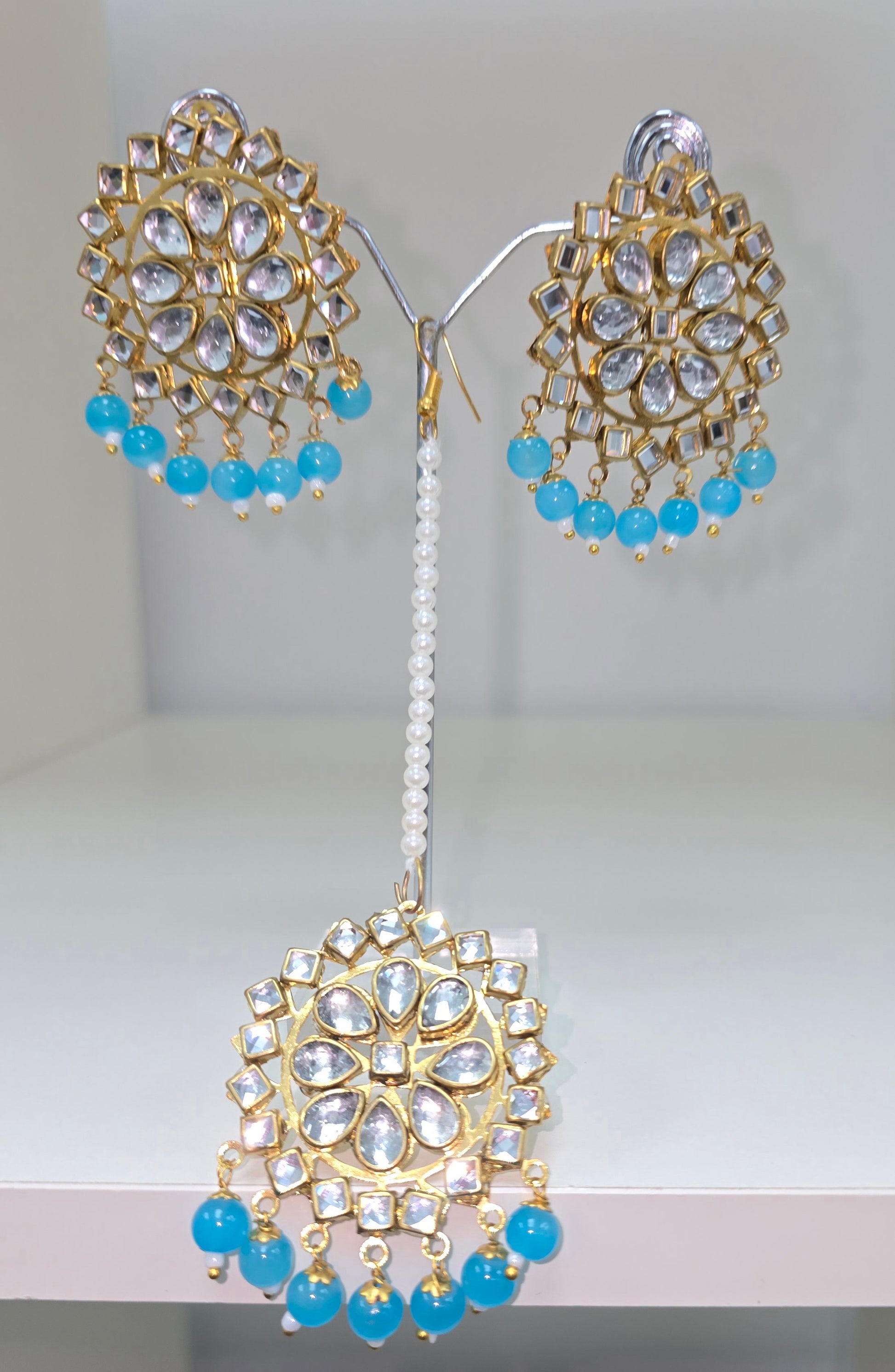 This exquisite Kundan tikka and earrings set is adorned with sparkling firozi hanging pearls for an elegant touch. Perfect for special occasions, this set will add a touch of sophistication and grace to any outfit. Made with intricate craftsmanship, this set is a must-have for any jewelry collection.