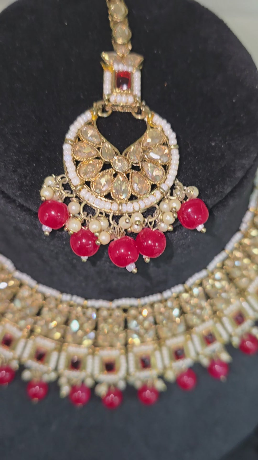 Expertly crafted with exquisite polki stones, this stunning red partywear set completes any look with its earrings and tikka. Elevate your ensemble and make a statement with this elegant and timeless accessory. Perfect for any occasion, this set adds a touch of glamour and sophistication.
