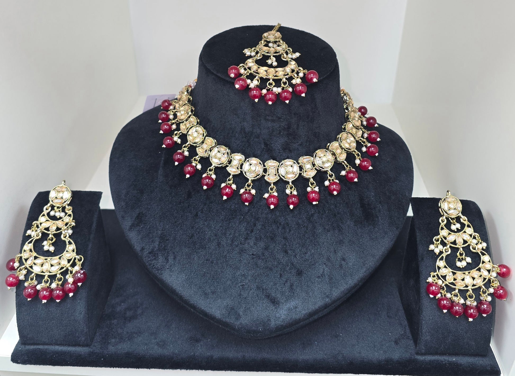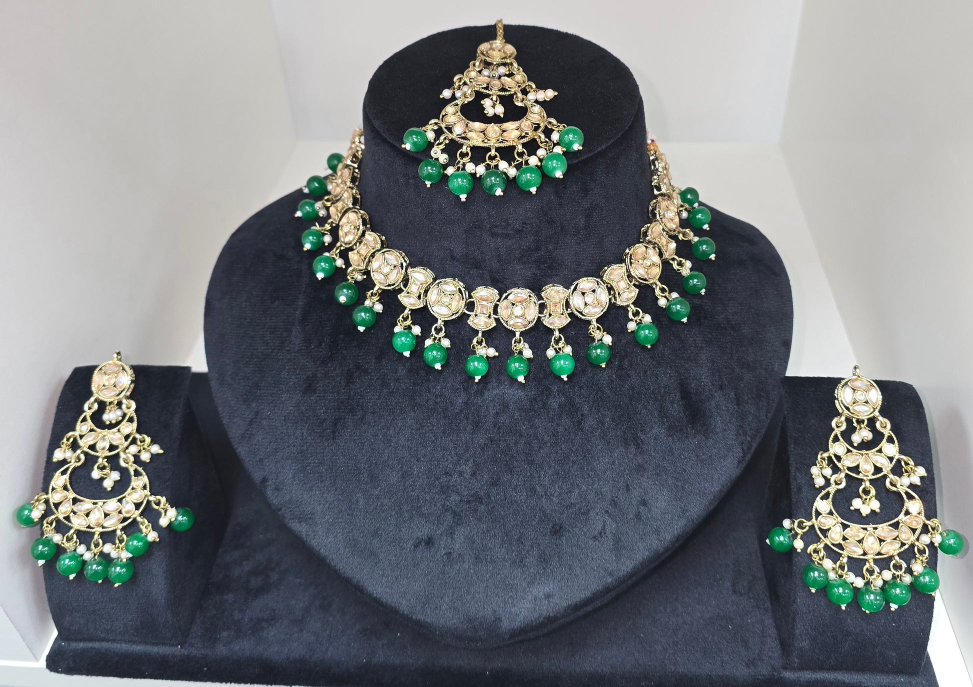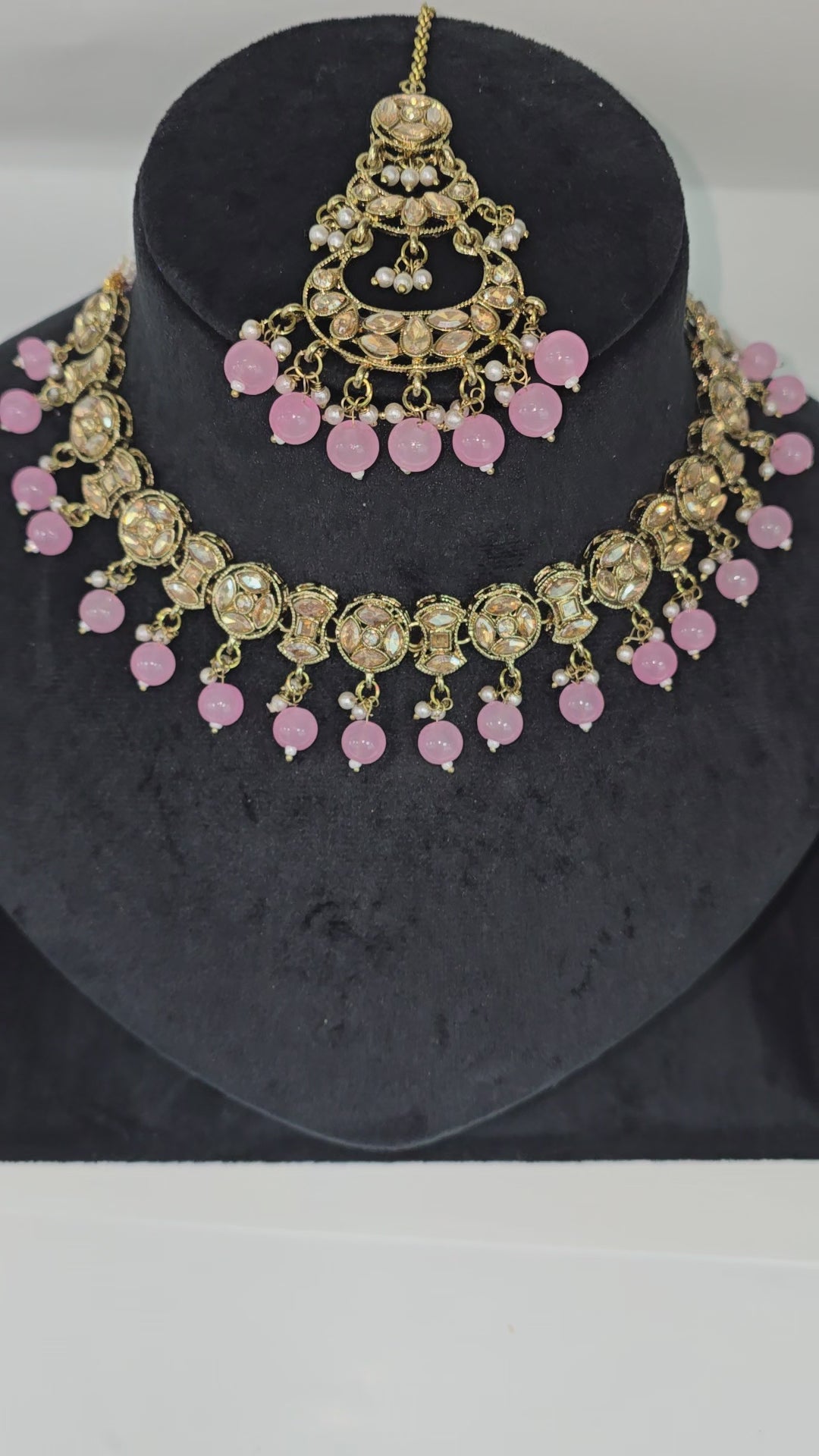 This elegant Partywear Polki Set features light pink pearls and matching Earrings and Tikka. The Polki set is perfect for any special occasion, providing a touch of glamour and sophistication. Elevate your look with this timeless piece of jewellery, crafted with high-quality materials and intricate design.(BIBACPA)