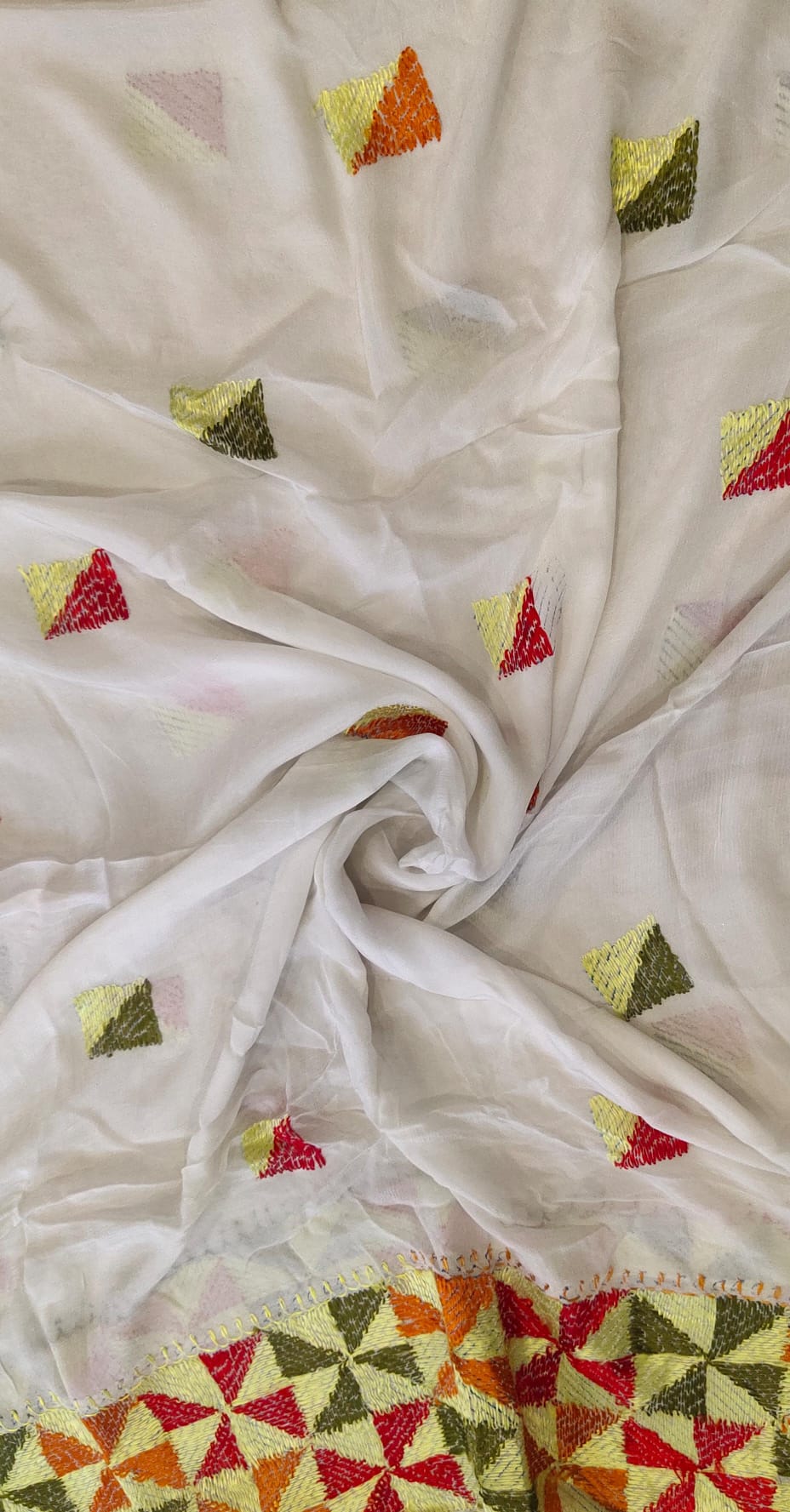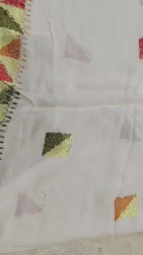 Experience the elegance of our Phulkari Duppatta in cream colour. Hand-embroidered with intricate details on pure chiffon, it boasts stunning colour combinations. Elevate your style with this must-have accessory.