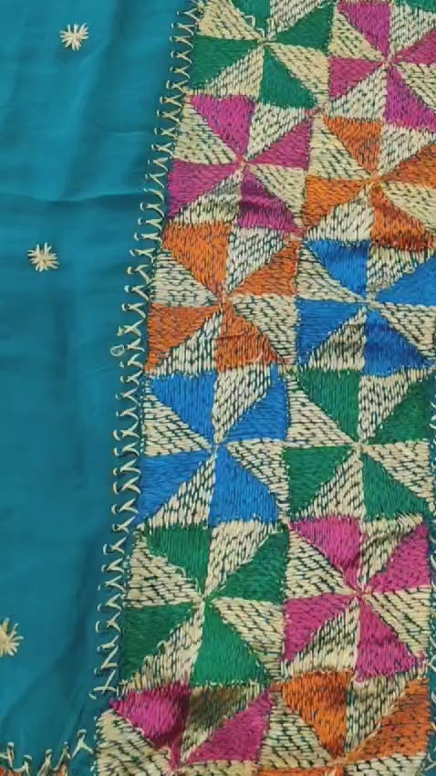 Introducing our Phulkari in Peacock colour. This stunning dupatta features intricate embroidery around borders and includes delicate patches for added detail. The perfect combination of colours makes this a must-have accessory for any occasion. Add a touch of elegance to your wardrobe with this beautiful Phulkari.
