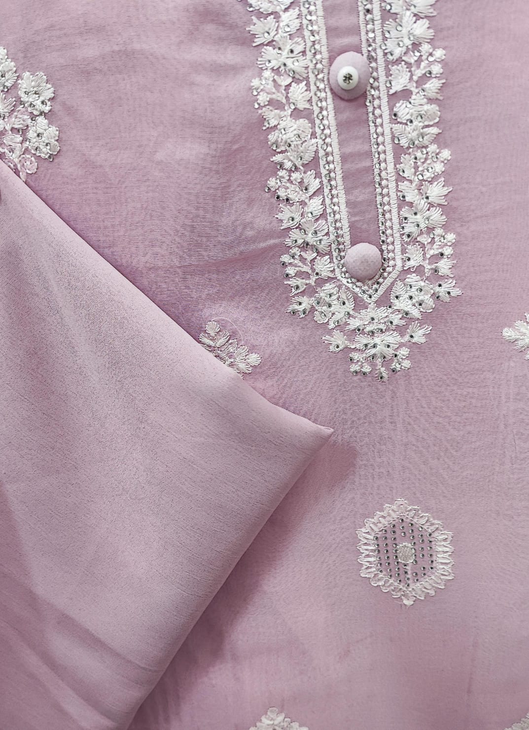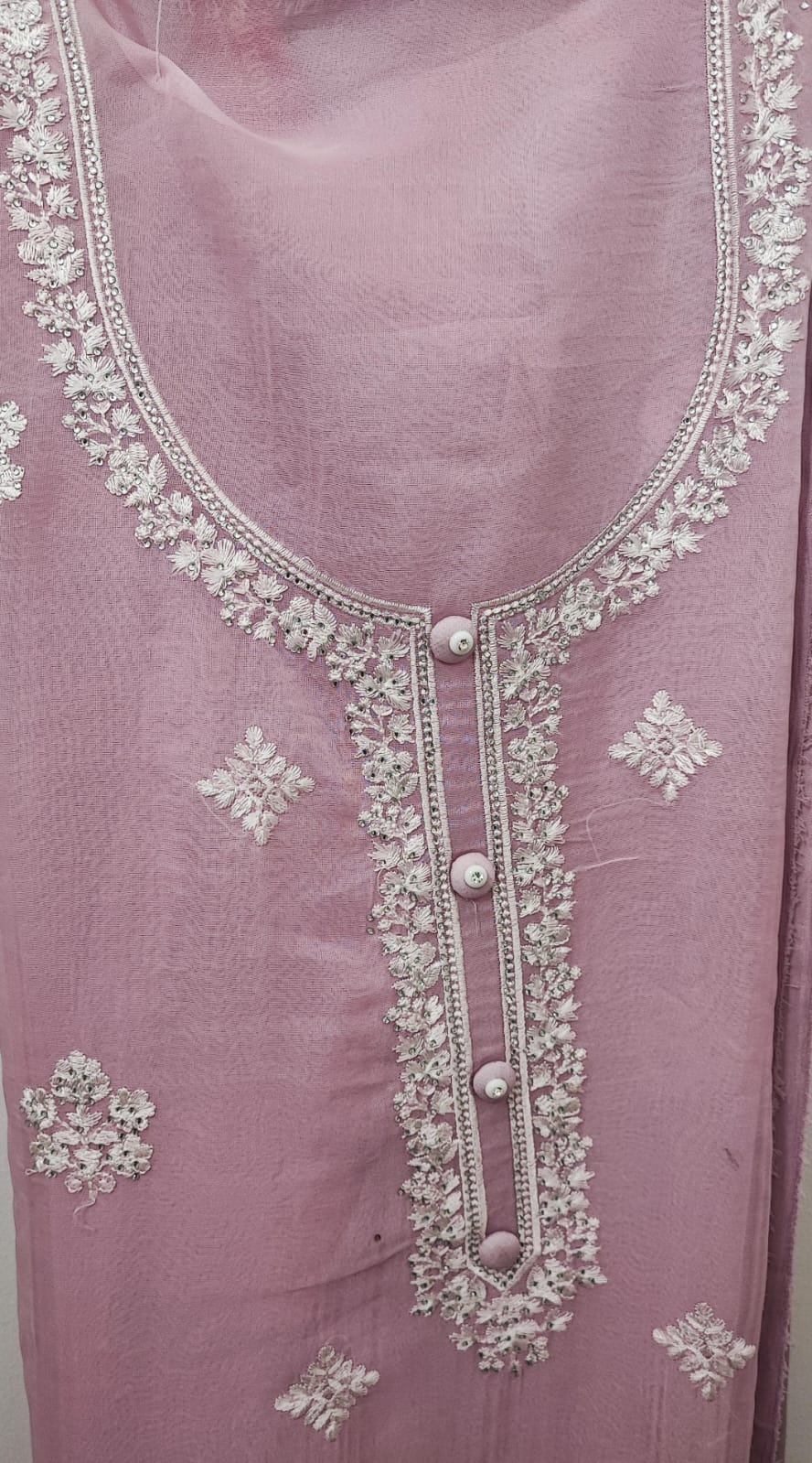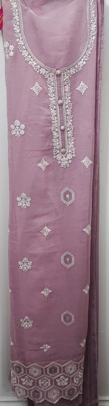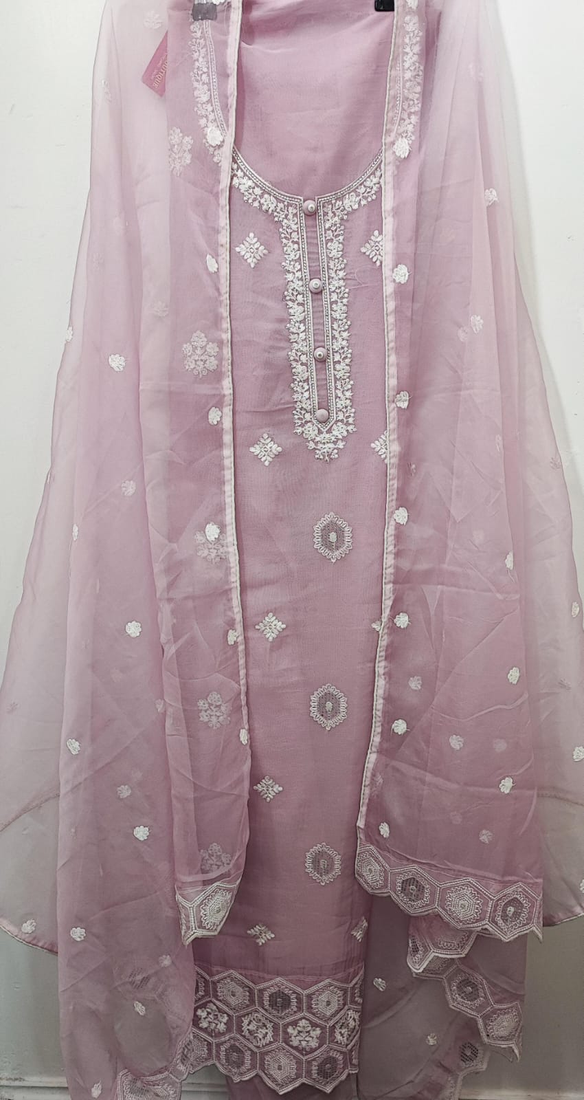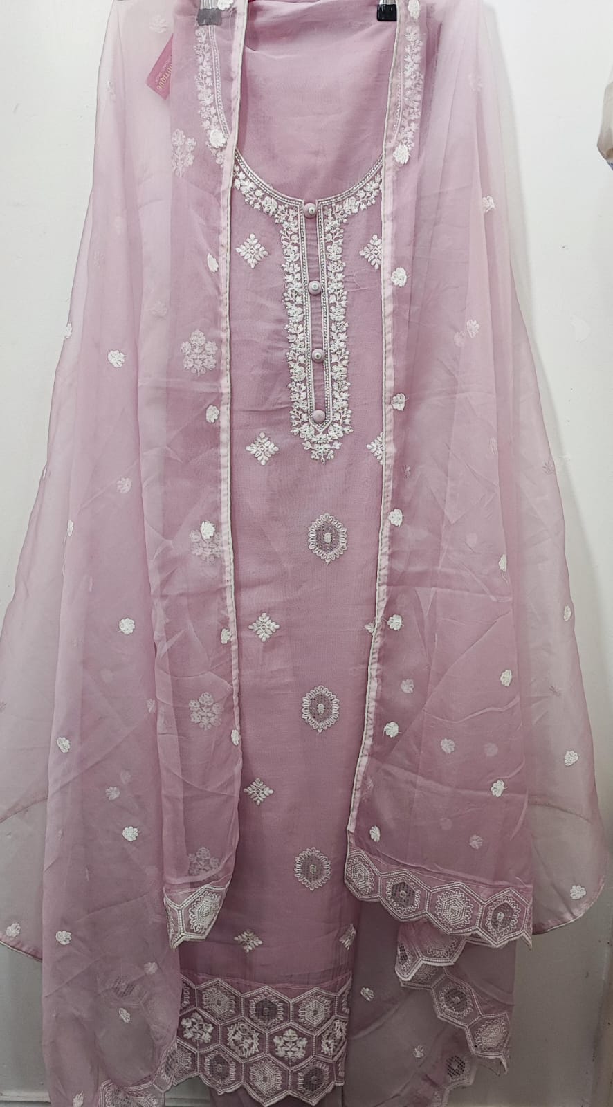 This unstitched dress material in tissue in a beautiful onion colour features delicate white thread embroidery on the front palla and dupatta. With the ability to be stitched into any style of salwar or trousers, this 3-piece set offers endless possibilities for creating a unique and stylish outfit. Elevate your wardrobe with this versatile and elegant dress material.