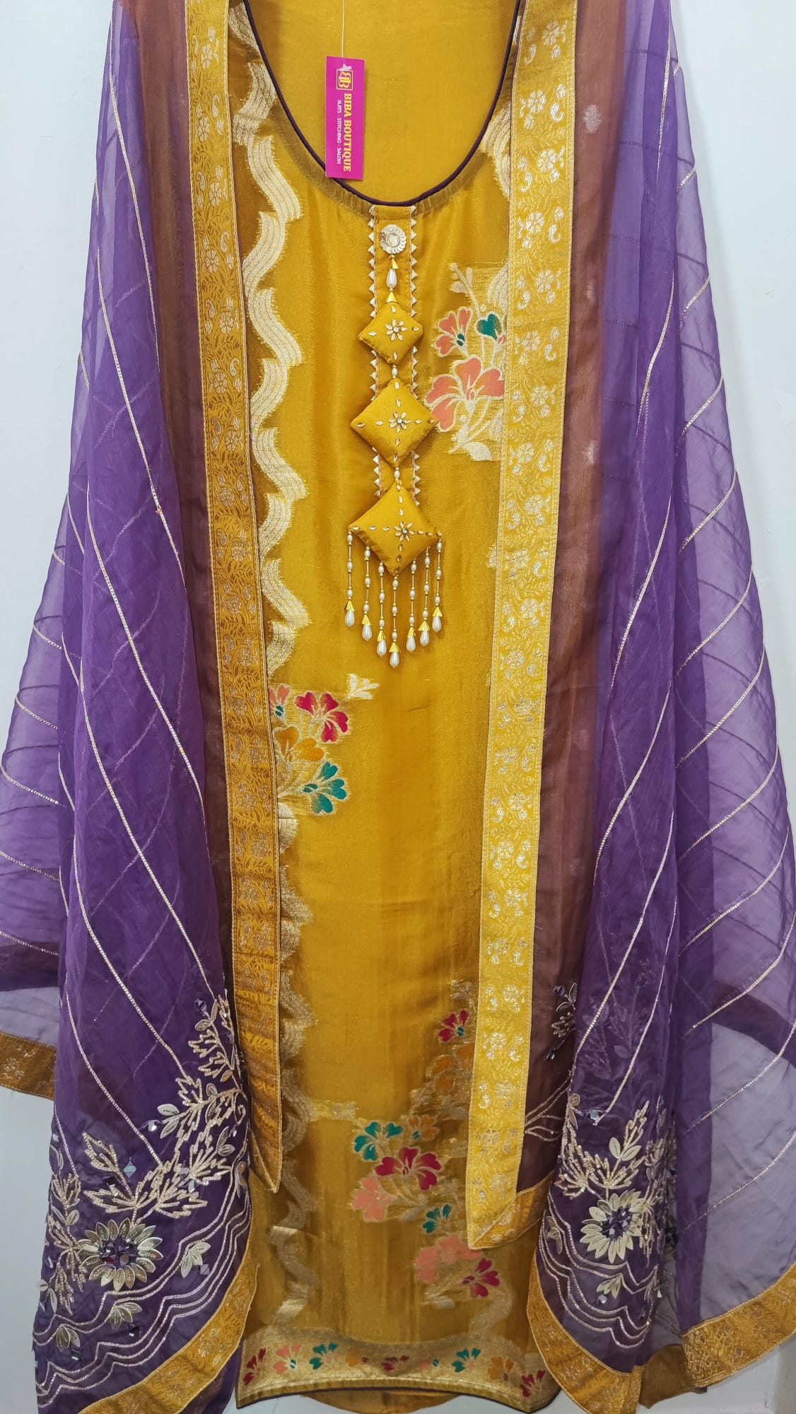 This 3 piece dress material features a striking combination of contrast colours, with a fancy front neck and palla design. The lightweight and elegant dupatta in purple tissue material is adorned with a border all around and gotta pati work on both sides. The unstitched bottom material offers versatility, allowing you to create a stylish salwar or trousers.